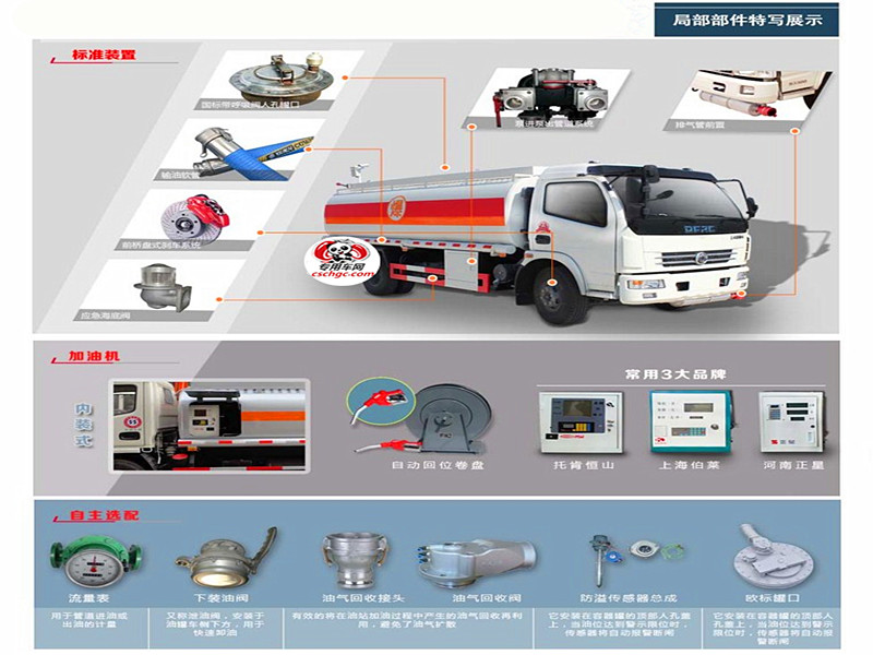 配備電腦稅控加油機(jī),自動(dòng)回位卷盤(pán),加油槍,帶取力器,專(zhuān)用油泵,兩根等長(zhǎng)輸油管,三通球閥扳手一把,兩把小鎖,兩支滅火器,兩個(gè)堵蓋,一個(gè)防火帽,兩側(cè)及后加強(qiáng)型保險(xiǎn)杠,折疊式防護(hù)欄,后防滑爬梯.