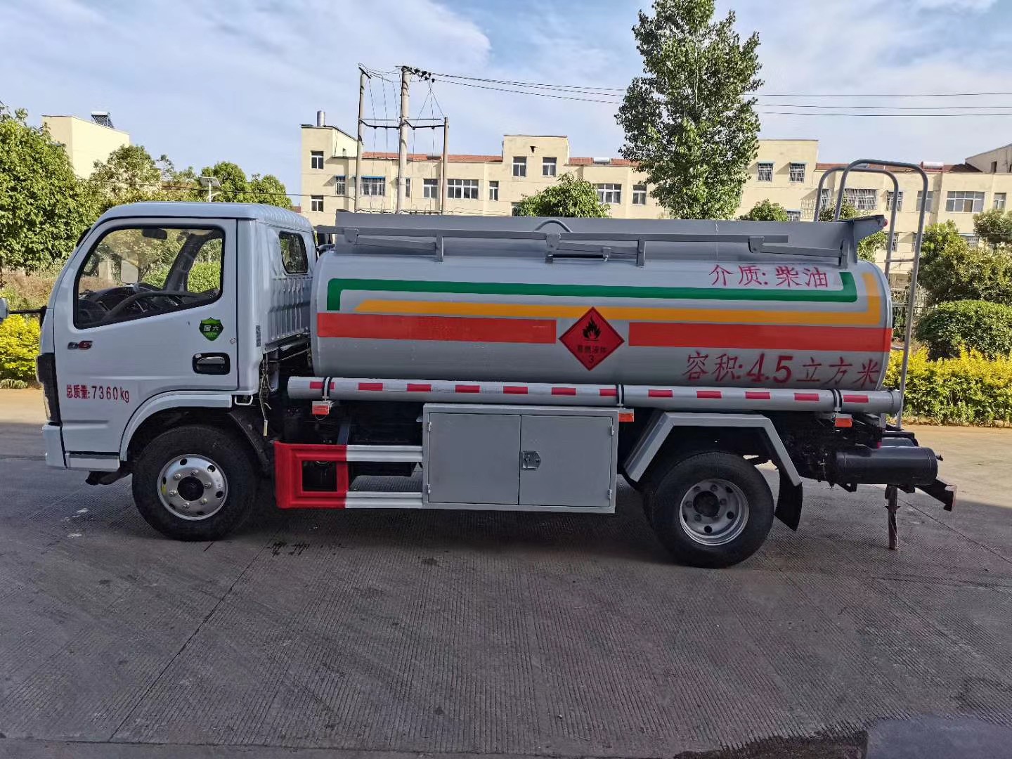 上裝配置:公告容積4.5立方, 嚴(yán)格按照公告尺寸制作罐體,罐體材質(zhì):Q235碳鋼,帶歐標(biāo):(歐標(biāo)罐口、防溢流探桿、靜電插座、油氣回收、下裝油、海底閥),罐體厚度≥4.2mm,車載專用油泵、帶大流量加油機及15米自動回位卷盤,帶自動調(diào)整臂,海底閥時速5公里智能報警,折疊護欄、兩根罐體等長輸油管、兩個滅火器、一個防火帽、安全告示鐵牌、工具箱、全車歐式鎖、牌照燈,其余標(biāo)配。油漆:銀灰、貼反光條、反光帶、安全告示、貼 “易燃” 標(biāo)。