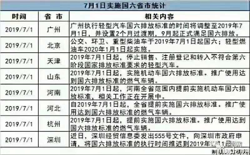 對于達到強制報廢標(biāo)準(zhǔn)的車輛,依法實施強制報廢。2020年年底前,完成國家下達的國三及以下排放標(biāo)準(zhǔn)營運柴油貨車淘汰任務(wù)。對納入淘汰范圍的車輛,不予辦理變更、轉(zhuǎn)移登記及核發(fā)檢驗合格標(biāo)志。提前淘汰取得《報廢汽車回收證明》并購買新能源貨車享受中央財政現(xiàn)行購置補貼政策。按照國家要求,積極研究建立與柴油貨車淘汰更新相掛鉤的新能源車輛運營補貼機制,制定實施便利通行政策。 二,2019年7月1日部分城市實施國六時間統(tǒng)計對照表: